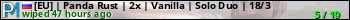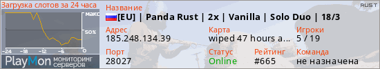 [EU] | Panda Rust | 2x | Vanilla | Solo Duo | 18/3 представлен в виде сервера раст. Из всех имеющихся на сайте модификаций игровых серверов, вам может понравиться NoDecay серверы rust. А для быстрой навигации по всем меткам - используйте главную страницу игры Rust.