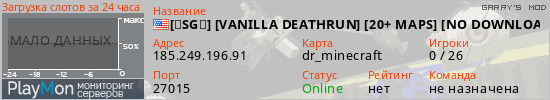 dr_minecraft (12:43 14.10.2025) Кстати, эта карта на 2 серверах Общая информация ID: 38849 Ссылка: https://playmon.ru/server/185.249.196.91:27015 Адрес: 185.249.196.91:27015 Игроки: 0/26 Статус: Включен Владелец: Не определён