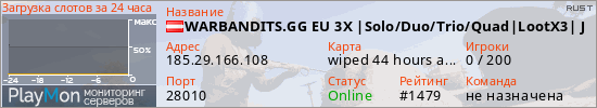 WARBANDITS.GG EU 3X |Solo/Duo/Trio/Quad|LootX3| JUST WIPED представлен в виде сервера раст. Из всех имеющихся на сайте модификаций игровых серверов, наша система поставила метку Loot сервера rust. В нашем мониторинге игровых серверов вы так же можете найти быструю навигацию по всем меткам - используйте главную страницу игры Rust.