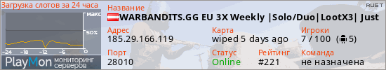 WARBANDITS.GG EU 3X Weekly |Solo/Duo|LootX3| Just Wiped представлен в виде сервера раст. Из всех имеющихся на сайте модификаций игровых серверов, наша система поставила метку Loot сервера rust. В нашем мониторинге игровых серверов вы так же можете найти быструю навигацию по всем меткам - используйте главную страницу игры Rust.