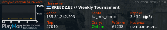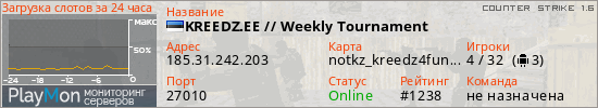 KREEDZ.EE // Weekly Tournament представлен в виде сервера кс 1.6. Из всех имеющихся на сайте модификаций игровых серверов, вам может понравиться Hide'n'Seek серверы cs. А для быстрой навигации по всем меткам - используйте главную страницу игры Counter Strike 1.6.