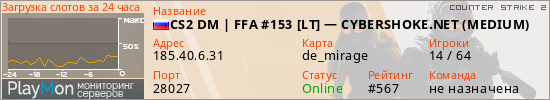 CS2 DM | FFA #153 [LT] — CYBERSHOKE.NET (MEDIUM) представлен в виде сервера кс 2. Из всех имеющихся на сайте модификаций игровых серверов, наша система поставила метку DeathMatch сервера cs2. В нашем мониторинге игровых серверов вы так же можете найти где поиграть на FFA сервере кс 2.