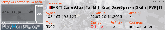 [MGT] Exile Altis|FullMil|Kits|BaseSpawn|Skills|PVP|FPS+ представлен в виде