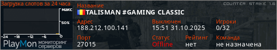 TALISMAN #GAMING CLASSIC представлен в виде сервера кс 1.6. Из всех имеющихся на сайте модификаций игровых серверов, наша система поставила метку Classic сервера cs. В нашем мониторинге игровых серверов вы так же можете найти быструю навигацию по всем меткам - используйте главную страницу игры Counter Strike 1.6.