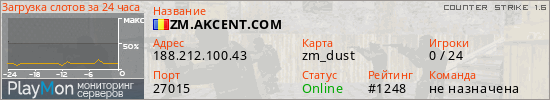 ZM.AKCENT.COM представлен в виде сервера кс 1.6. Из всех имеющихся на сайте модификаций игровых серверов, наша система поставила метку Zombie сервера cs. В нашем мониторинге игровых серверов вы так же можете найти быструю навигацию по всем меткам - используйте главную страницу игры Counter Strike 1.6.