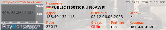 PUBLIC [100TICK + NoAWP] представлен в виде сервера ксс. Из всех имеющихся на сайте модификаций игровых серверов, наша система поставила метку AWP сервера css. В нашем мониторинге игровых серверов вы так же можете найти быструю навигацию по всем меткам - используйте главную страницу игры Counter Strike Source.