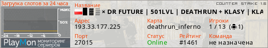 █ ▓ ▒ × DR FUTURE | 501LVL | DEATHRUN + KLASY | KLANY | EVENTY | HONOR | SEZON 1 | GAMEFUTURE.PL представлен в виде сервера кс 1.6. Из всех имеющихся на сайте модификаций игровых серверов, наша система поставила метку DeathRun сервера cs. В нашем мониторинге игровых серверов вы так же можете найти быструю навигацию по всем меткам - используйте главную страницу игры Counter Strike 1.6.