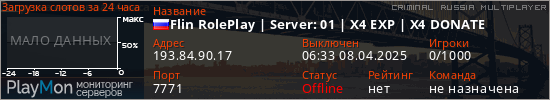 Общая информация ID: 65484 Ссылка: https://playmon.ru/server/193.84.90.17:7771 Версия: 0.3.7-R2 Адрес: 193.84.90.17:7771 Игроки: 0/1000 Статус: Выключен Владелец: Не определён