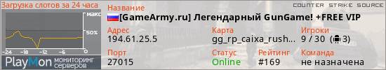 [GameArmy.ru] Легендарный GunGame! +FREE VIP представлен в виде сервера ксс. Из всех имеющихся на сайте модификаций игровых серверов, наша система поставила метку GunGame сервера css. В нашем мониторинге игровых серверов вы так же можете найти быструю навигацию по всем меткам - используйте главную страницу игры Counter Strike Source.