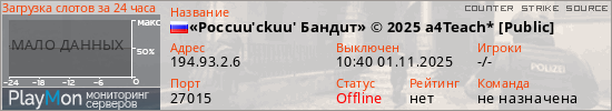 Общая информация ID: 69566 Ссылка: https://playmon.ru/server/194.93.2.6:27015 Адрес: 194.93.2.6:27015 Игроки: 0/16 Статус: Выключен Владелец: Не определён