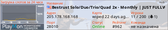 Bestrust Solo/Duo/Trio/Quad 2x - Monthly | JUST FULLWIPED 05.02 представлен в виде сервера раст. Из всех имеющихся на сайте модификаций игровых серверов, вам может понравиться NoDecay серверы rust. А для быстрой навигации по всем меткам - используйте главную страницу игры Rust.