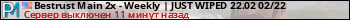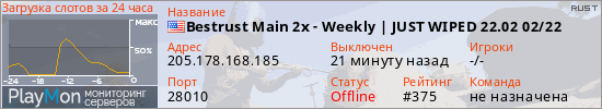 Bestrust Main 2x - Weekly | JUST WIPED 22.02 02/22 представлен в виде сервера раст. Из всех имеющихся на сайте модификаций игровых серверов, вам может понравиться NoDecay серверы rust. А для быстрой навигации по всем меткам - используйте главную страницу игры Rust.