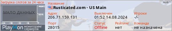 Rusticated.com - US Main представлен в виде сервера раст. Из всех имеющихся на сайте модификаций игровых серверов, вам может понравиться PvE серверы rust. А для быстрой навигации по всем меткам - используйте главную страницу игры Rust.