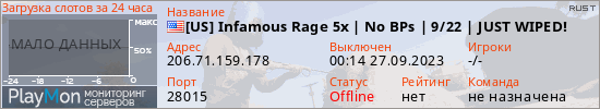 [US] Infamous Rage 5x | No BPs | 9/22 | JUST WIPED! представлен в виде сервера раст. Из всех имеющихся на сайте модификаций игровых серверов, вам может понравиться PvE серверы rust. А для быстрой навигации по всем меткам - используйте главную страницу игры Rust.