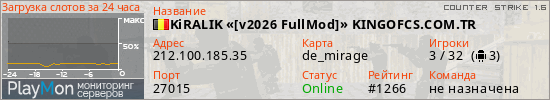 KiRALIK «[v2026 FullMod]» KINGOFCS.COM.TR представлен в виде сервера кс 1.6. Из всех имеющихся на сайте модификаций игровых серверов, вам может понравиться GunGame серверы cs. А для быстрой навигации по всем меткам - используйте главную страницу игры Counter Strike 1.6.