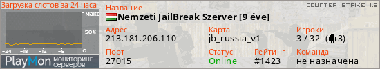Nemzeti JailBreak Szerver [9 éve] представлен в виде сервера кс 1.6. Из всех имеющихся на сайте модификаций игровых серверов, наша система поставила метку JailBreak сервера cs. В нашем мониторинге игровых серверов вы так же можете найти быструю навигацию по всем меткам - используйте главную страницу игры Counter Strike 1.6.