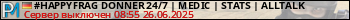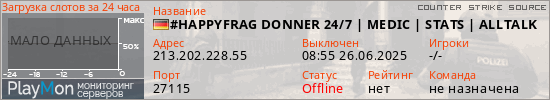 #HAPPYFRAG DONNER 24/7 | MEDIC | STATS | ALLTALK представлен в виде сервера ксс. Из всех имеющихся на сайте модификаций игровых серверов, вам может понравиться AWP серверы css. А для быстрой навигации по всем меткам - используйте главную страницу игры Counter Strike Source.