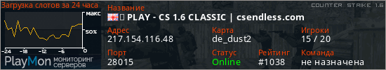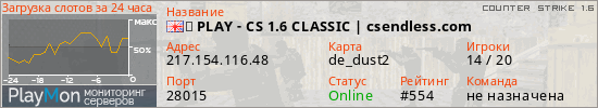 ➤ PLAY - CS 1.6 CLASSIC | csendless.com представлен в виде сервера кс 1.6. Из всех имеющихся на сайте модификаций игровых серверов, наша система поставила метку Classic сервера cs. В нашем мониторинге игровых серверов вы так же можете найти быструю навигацию по всем меткам - используйте главную страницу игры Counter Strike 1.6.