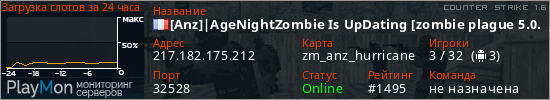 [Anz]|AgeNightZombie Is UpDating [zombie plague 5.0.8] представлен в виде сервера кс 1.6. Из всех имеющихся на сайте модификаций игровых серверов, наша система поставила метку Zombie сервера cs. В нашем мониторинге игровых серверов вы так же можете найти быструю навигацию по всем меткам - используйте главную страницу игры Counter Strike 1.6.