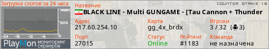 BLACK LINE - Multi GUNGAME - [Tau Cannon + Thunder + ZEUS ] EXGG представлен в виде сервера кс 1.6. Из всех имеющихся на сайте модификаций игровых серверов, наша система поставила метку GunGame сервера cs. В нашем мониторинге игровых серверов вы так же можете найти быструю навигацию по всем меткам - используйте главную страницу игры Counter Strike 1.6.