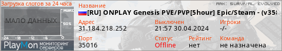 Общая информация ID: 55291 Ссылка: https://playmon.ru/server/31.184.218.252:35016 Адрес: 31.184.218.252:35016 Игроки: 0/70 Статус: Выключен Владелец: Не определён