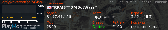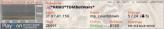 *RRMS*TDMBotWars* представлен в виде сервера код 4. Из всех имеющихся на сайте модификаций игровых серверов, наша система поставила метку Deathmatch сервера cod4. В нашем мониторинге игровых серверов вы так же можете найти быструю навигацию по всем меткам - используйте главную страницу игры Call of Duty 4: Modern Warfare.