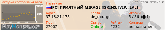 [РС] ПРИЯТНЫЙ MIRAGE [!SKINS, !VIP, !LVL] представлен в виде сервера кс 2. Из всех имеющихся на сайте модификаций игровых серверов, вам может понравиться Retake серверы cs2. А для быстрой навигации по всем меткам - используйте главную страницу игры Counter Strike 2.