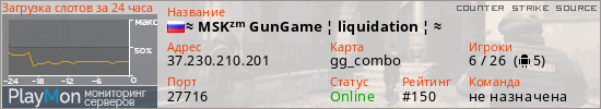 ≈ MSKᶻᵐ GunGame ¦ liquidation ¦ ≈ представлен в виде сервера ксс. Из всех имеющихся на сайте модификаций игровых серверов, наша система поставила метку GunGame сервера css. В нашем мониторинге игровых серверов вы так же можете найти быструю навигацию по всем меткам - используйте главную страницу игры Counter Strike Source.