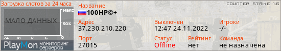 Общая информация ID: 52131 Ссылка: https://playmon.ru/server/37.230.210.220:27015 Адрес: 37.230.210.220:27015 Игроки: 0/32 Статус: Выключен Владелец: Не определён