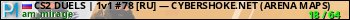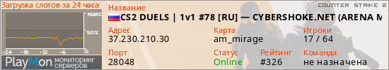 CS2 DUELS | 1v1 #78 [RU] — CYBERSHOKE.NET (ARENA MAPS) представлен в виде сервера кс 2. Из всех имеющихся на сайте модификаций игровых серверов, наша система поставила метку 1vs1 сервера cs2. В нашем мониторинге игровых серверов вы так же можете найти быструю навигацию по всем меткам - используйте главную страницу игры Counter Strike 2.