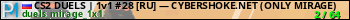 CS2 DUELS | 1v1 #28 [RU] — CYBERSHOKE.NET (ONLY MIRAGE) представлен в виде сервера кс 2. Из всех имеющихся на сайте модификаций игровых серверов, наша система поставила метку 1vs1 сервера cs2. В нашем мониторинге игровых серверов вы так же можете найти быструю навигацию по всем меткам - используйте главную страницу игры Counter Strike 2.