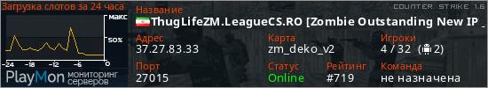 ThugLifeZM.LeagueCS.RO [Zombie Outstanding New IP!] представлен в виде сервера кс 1.6. Из всех имеющихся на сайте модификаций игровых серверов, наша система поставила метку Zombie сервера cs. В нашем мониторинге игровых серверов вы так же можете найти быструю навигацию по всем меткам - используйте главную страницу игры Counter Strike 1.6.