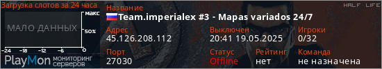 Общая информация ID: 67557 Ссылка: https://playmon.ru/server/45.126.208.112:27030 Адрес: 45.126.208.112:27030 Игроки: 0/32 Статус: Выключен Владелец: Не определён
