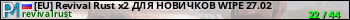 [EU] Revival Rust x2 ДЛЯ НОВИЧКОВ WIPE 27.02 представлен в виде сервера раст. Из всех имеющихся на сайте модификаций игровых серверов, вам может понравиться Kits серверы rust. А для быстрой навигации по всем меткам - используйте главную страницу игры Rust.