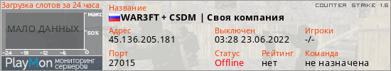 WAR3FT + CSDM | Своя компания представлен в виде сервера кс 1.6. Из всех имеющихся на сайте модификаций игровых серверов, наша система поставила метку DeathMatch сервера cs. В нашем мониторинге игровых серверов вы так же можете найти где поиграть на War3FT сервере кс 1.6.