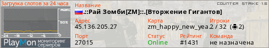 .::Рай Зомби[ZM]::.[Вторжение Гигантов] представлен в виде сервера кс 1.6. Из всех имеющихся на сайте модификаций игровых серверов, наша система поставила метку Zombie сервера cs. В нашем мониторинге игровых серверов вы так же можете найти быструю навигацию по всем меткам - используйте главную страницу игры Counter Strike 1.6.