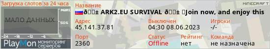 Общая информация ID: 52757 Ссылка: https://playmon.ru/server/45.141.37.81:2360 Версия: 1.19.2 Адрес: 45.141.37.81:2360 Игроки: 0/40 Статус: Выключен Владелец: Не определён