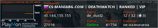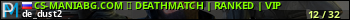 CS-MANIABG.COM ✪ DEATHMATCH | RANKED | VIP представлен в виде сервера кс 1.6. Из всех имеющихся на сайте модификаций игровых серверов, наша система поставила метку DeathMatch сервера cs. В нашем мониторинге игровых серверов вы так же можете найти быструю навигацию по всем меткам - используйте главную страницу игры Counter Strike 1.6.