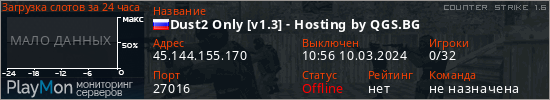 Dust2 Only [v1.3] - Hosting by QGS.BG представлен в виде сервера кс 1.6. Из всех имеющихся на сайте модификаций игровых серверов, вам может понравиться DeathMatch серверы cs. А для быстрой навигации по всем меткам - используйте главную страницу игры Counter Strike 1.6.