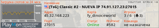 [TsG] Classic #2 - NUEVA IP 74.91.127.23:27015 представлен в виде сервера кс 1.6. Из всех имеющихся на сайте модификаций игровых серверов, наша система поставила метку Classic сервера cs. В нашем мониторинге игровых серверов вы так же можете найти быструю навигацию по всем меткам - используйте главную страницу игры Counter Strike 1.6.
