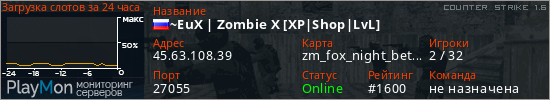 ~EuX | Zombie X [XP|Shop|LvL] представлен в виде сервера кс 1.6. Из всех имеющихся на сайте модификаций игровых серверов, наша система поставила метку Zombie сервера cs. В нашем мониторинге игровых серверов вы так же можете найти быструю навигацию по всем меткам - используйте главную страницу игры Counter Strike 1.6.