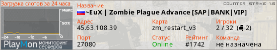 ~EuX | Zombie Plague Advance [SAP|BANK|VIP] представлен в виде сервера кс 1.6. Из всех имеющихся на сайте модификаций игровых серверов, наша система поставила метку Zombie сервера cs. В нашем мониторинге игровых серверов вы так же можете найти быструю навигацию по всем меткам - используйте главную страницу игры Counter Strike 1.6.