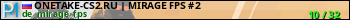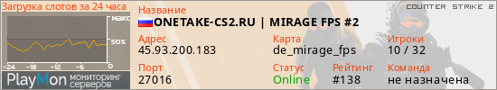 ONETAKE-CS2.RU | MIRAGE FPS #2 представлен в виде сервера кс 2. Из всех имеющихся на сайте модификаций игровых серверов, вам может понравиться DeathMatch серверы cs2. А для быстрой навигации по всем меткам - используйте главную страницу игры Counter Strike 2.
