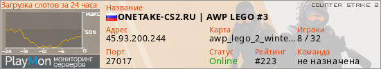 ONETAKE-CS2.RU | AWP LEGO #3 представлен в виде сервера кс 2. Из всех имеющихся на сайте модификаций игровых серверов, наша система поставила метку AWP сервера cs2. В нашем мониторинге игровых серверов вы так же можете найти быструю навигацию по всем меткам - используйте главную страницу игры Counter Strike 2.