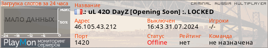 Общая информация ID: 61301 Ссылка: https://playmon.ru/server/46.105.43.212:1420 Версия: 0.3.7-R2 Адрес: 46.105.43.212:1420 Игроки: 0/500 Статус: Выключен Владелец: Не определён