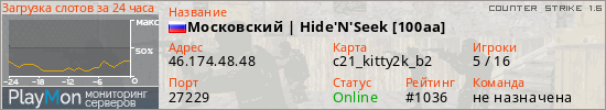 Московский | Hide'N'Seek [100aa] представлен в виде сервера кс 1.6. Из всех имеющихся на сайте модификаций игровых серверов, наша система поставила метку Hide'n'Seek сервера cs. В нашем мониторинге игровых серверов вы так же можете найти быструю навигацию по всем меткам - используйте главную страницу игры Counter Strike 1.6.