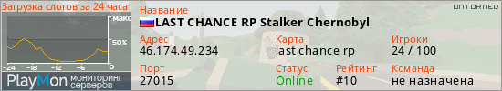 LAST CHANCE RP Stalker Chernobyl представлен в виде сервера Unturned. Из всех имеющихся на сайте модификаций игровых серверов, наша система поставила метку RP сервера unturned. В нашем мониторинге игровых серверов вы так же можете найти быструю навигацию по всем меткам - используйте главную страницу игры Unturned.