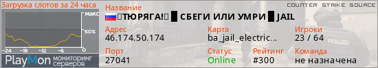 ★TЮPЯГA!★ █ CБEГИ ИЛИ УMPИ █ JAIL представлен в виде сервера ксс. Из всех имеющихся на сайте модификаций игровых серверов, наша система поставила метку JailBreak сервера css. В нашем мониторинге игровых серверов вы так же можете найти быструю навигацию по всем меткам - используйте главную страницу игры Counter Strike Source.