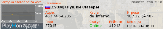 [CSDM]+Пушки+Лазеры представлен в виде сервера кс 1.6. Из всех имеющихся на сайте модификаций игровых серверов, наша система поставила метку Пушки + Лазеры сервера cs. В нашем мониторинге игровых серверов вы так же можете найти быструю навигацию по всем меткам - используйте главную страницу игры Counter Strike 1.6.