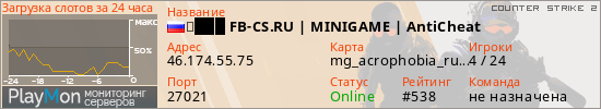 ➥███ FB-CS.RU | MINIGAME | AntiCheat представлен в виде сервера кс 2. Из всех имеющихся на сайте модификаций игровых серверов, наша система поставила метку MiniGame сервера cs2. В нашем мониторинге игровых серверов вы так же можете найти быструю навигацию по всем меткам - используйте главную страницу игры Counter Strike 2.